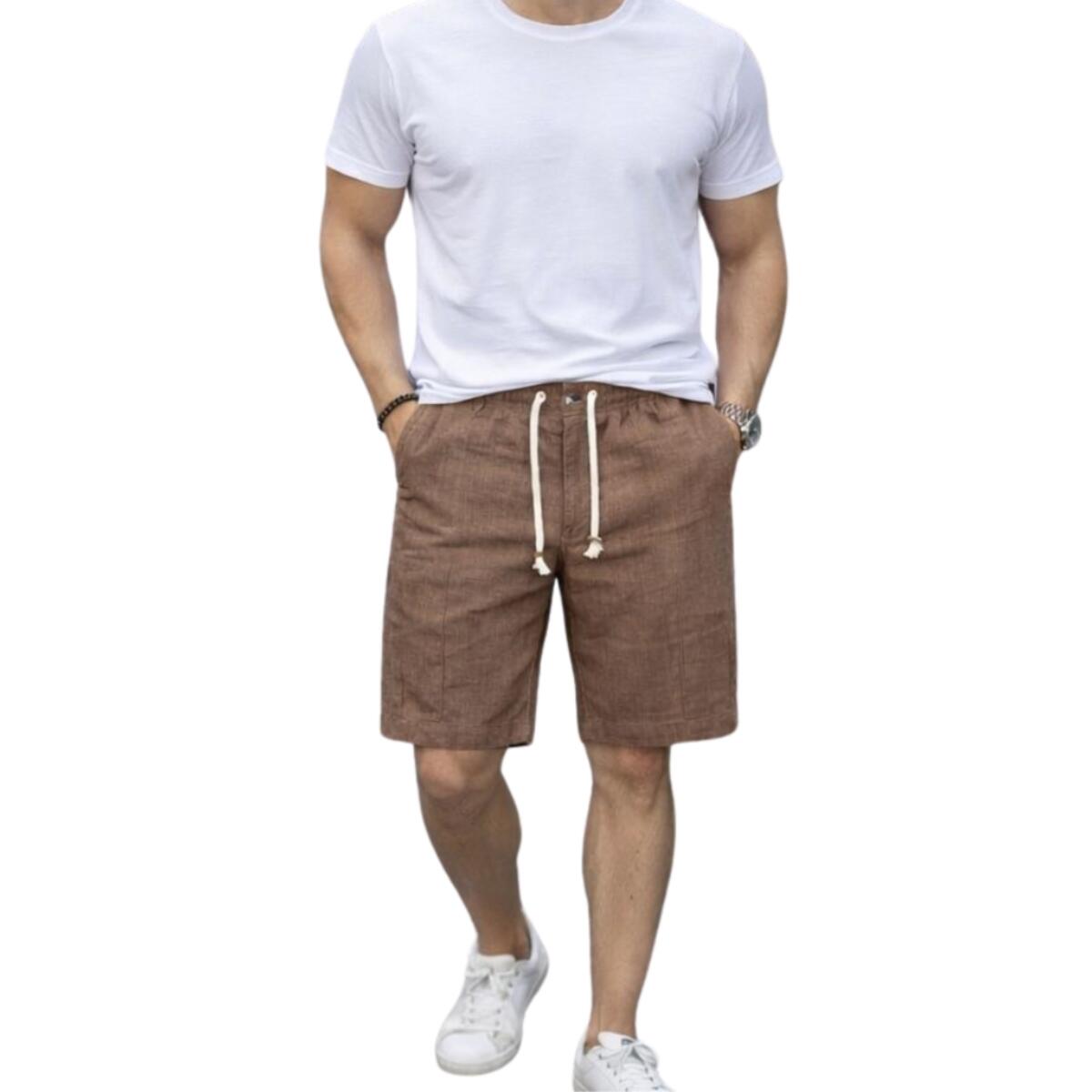 Pantalone corto modello bermuda da uomo primaverile in tessuto effetto lino fiammato con coulisse.
