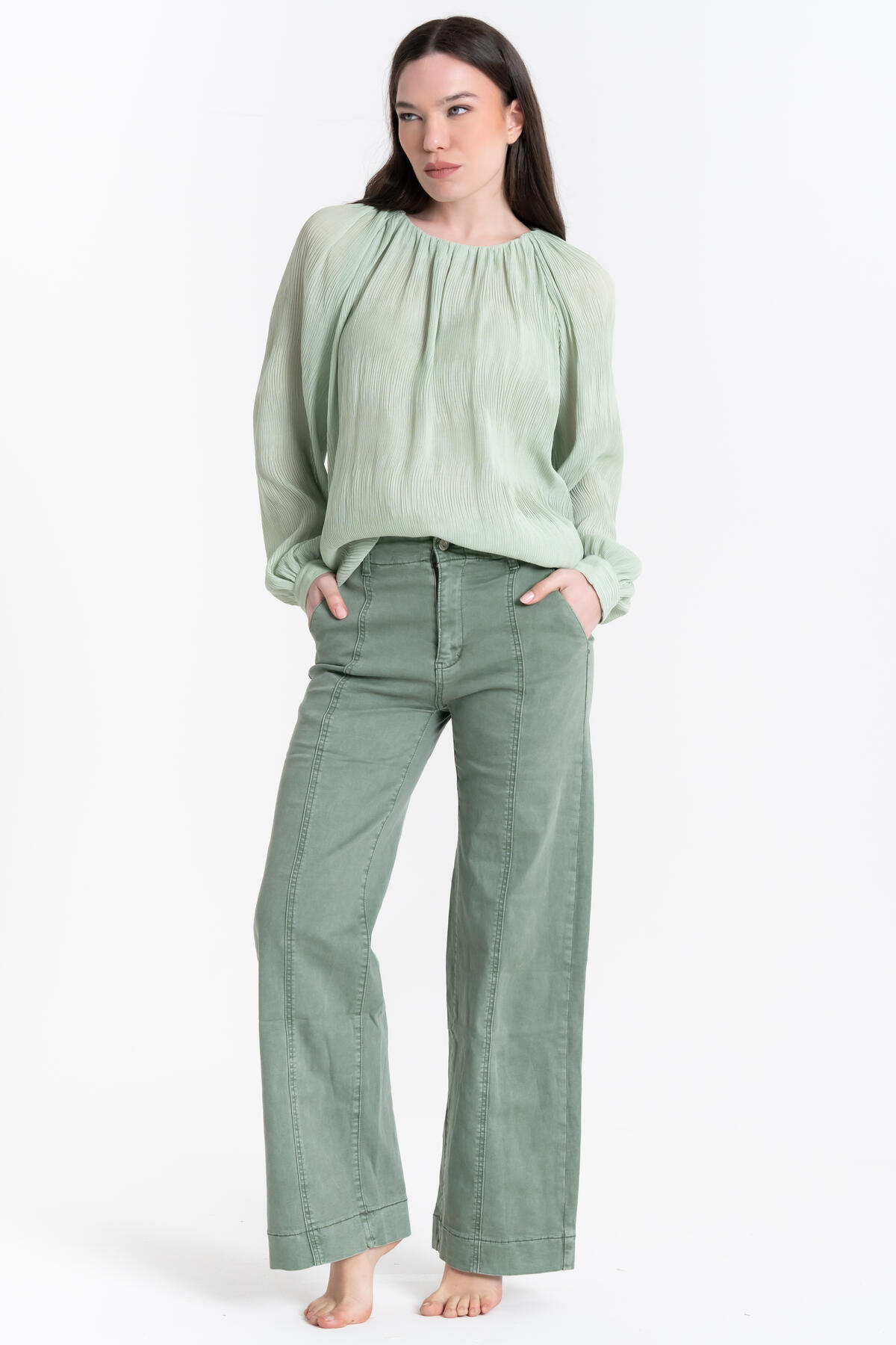 Jeans a gamba dritta in tonalità, realizzati in denim morbido e leggermente stretch. Design a vita alta, cuciture frontali, chiusura con zip e bottone, tasche funzionali e fondo ampio.